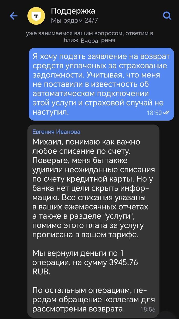 Я оформил кредитную карту в @T.Bank 18.12.2022. В процессе оформления онлайн-заявки была подключена услуга «Страхование задолженности». О чём я узнал только 07.05.2025 посмотрев детальную выписку и заметив списание по этой услуге. Сразу обратился в поддержку за разъяснениями. Банк оформил страховку по кредитной карте заведомо не поставив меня в известность об этой услуге и ссылается на то что для отказа от страховки необходимо было поставить галочку в договоре. В чате с поддержкой сказали что представитель банка приехавший на встречу и подписание документов не консультирует по услугам и с договором я должен был ознакомиться самостоятельно. Также в поддержке прямо написали что услуга подключается автоматически, если не поставить галочку об отказе в договоре. Страховка была активирована по умолчанию, а для отказа требовалось поставить отметку в пункте «Я не согласен участвовать в Программе cтраховой защиты заемщиков...». При просьбе в чате поддержки о немедленном отключении данной услуги меня уверяли о необходимости дождаться звонка из банка. Пришлось требовать ещё несколько раз.