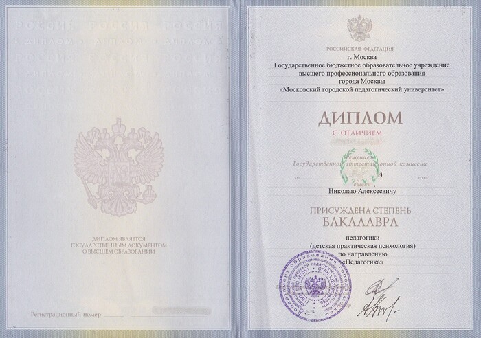 1. Базовое психолого-педагогическое образование полученное в 2013 году с очень странной формулировкой "Бакалавр педагогики (детская практическая психология)" по направлению педагогика, специализация "детская практическая психология";