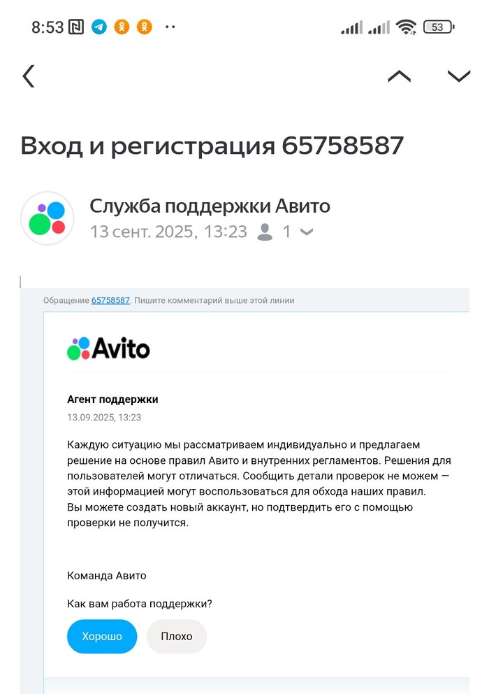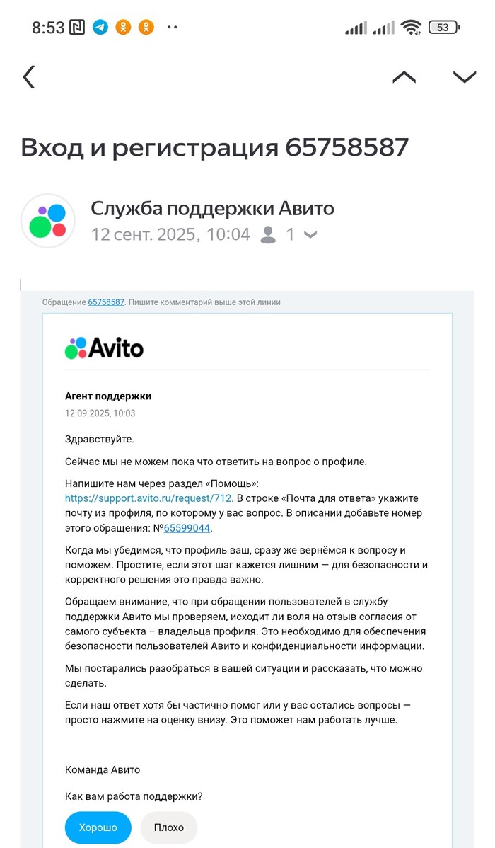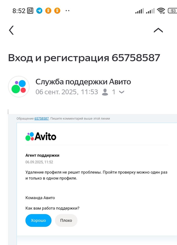 Служба поддержки предлагает зарегистрироваться заново, но система блокирует новый аккаунт ссылаясь на то, что у меня он уже есть, или предлагает связать аккаунты, что тоже не возможно, т.к. доступа к нему у меня нет. Но вот незадача, а он то удалён... ). И как позиционирует Авито прохождение верификации, дело сугубо добровольное и зарегистрироваться и работать аккаунт должен и без неё, но на деле нет. Получается, что если пользователь, проходит проверку и затем удаляет профиль , он фактически лишается возможности вновь зарегистрироваться на площадке. Это не только ограничение доступа к сервису но и нарушение моих конституционных прав, гарантированных ст.23 и ст. 24 Конституции РФ (право на неприкосновенность частной жизни и тайну переписки, а также запрет на сбор, хранение и распространение персональных данных без согласия субъекта).