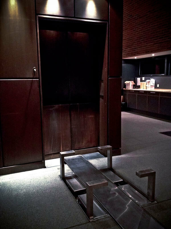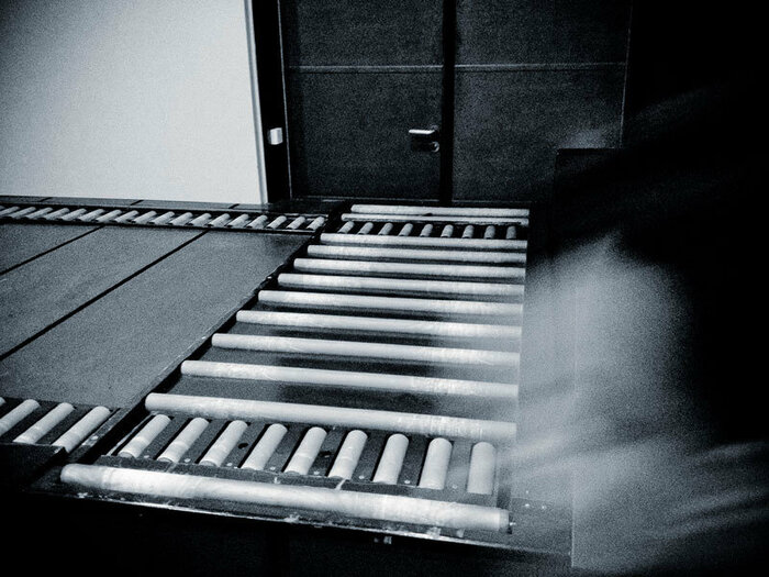 Выдвинутые салазки, на которых гроб въезжает в печь