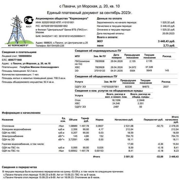 Заплатил Корякэнерго за сентябрь 3451 руб.