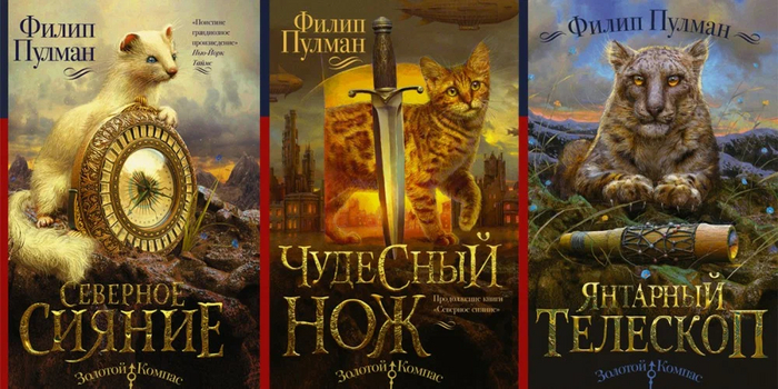 История о мире, в котором каждого человека сопровождает деймон - часть души этого человека в виде животного. У детей деймоны способны менять облик по желанию - от жучка до собаки, но в момент полового созревания деймон обретает постоянный облик. По сути, это главная фишка мира, к которой довольно много вопросов, но их разбор может занять еще одну целую книгу. Из менее главных фишек - раса разумных медведей, ведьмы, колдуны, Алетиометр, с помощью которого можно найти ответ на любой вопрос, мультивселенная, волшебный нож, способный открывать порталы в иные вселенные, ангелы, созданные из волшебной пыли, мир мертвых, цыгане, война с богом, феи, религиозная антиутопия, новая Ева... Ничего не упустил?