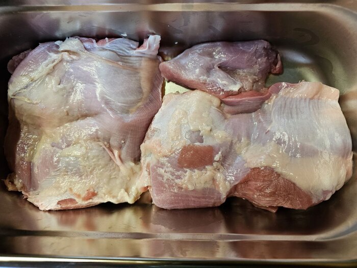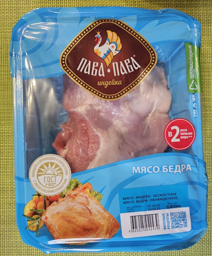 Недавно в магазине (по-моему в Пятерочке, а может в Ленте, уже не помню) увидел филе бедра индейки по акции. По акции беру его с удовольствием, легко готовить и получается вкусно. Взял две упаковки по 450 грамм. Обычно в каждой упаковке бывало по два небольших куска, в этот раз в одной упаковке был один здоровый кусок, а во второй - здоровый кусок (но чуть поменьше, чем в первой) и маленький "довесок"