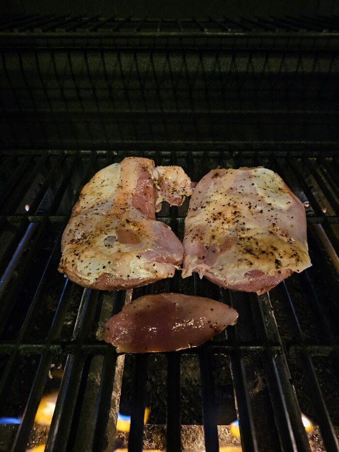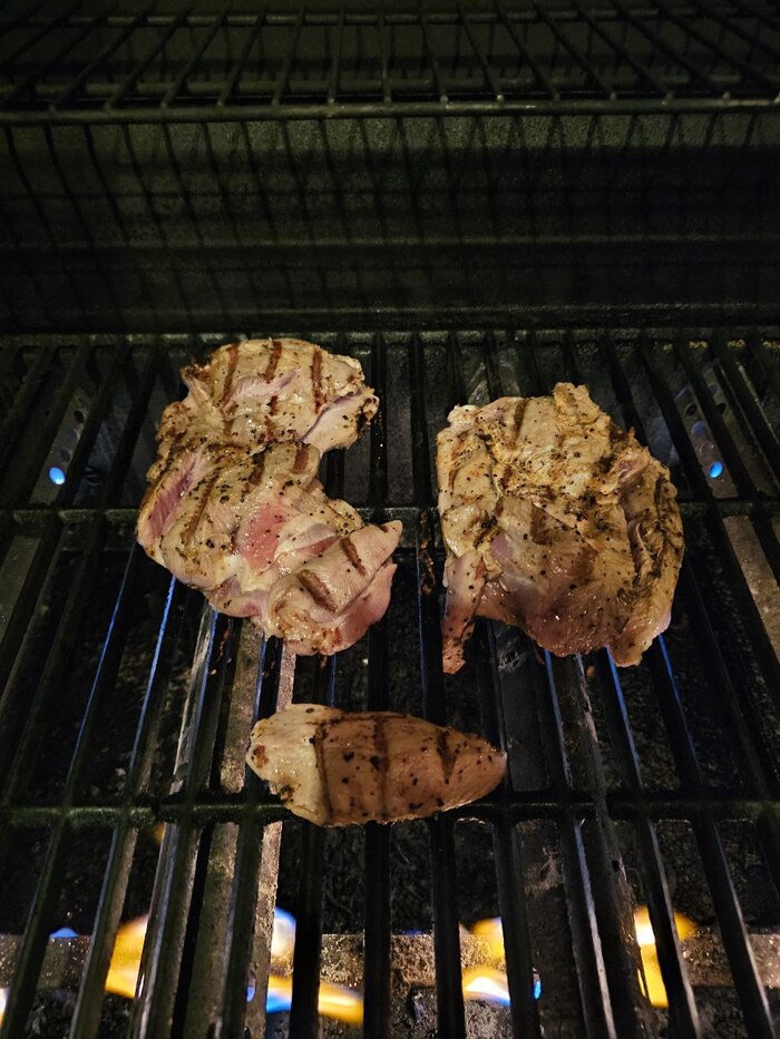 Когда проходит полтора часа иду разогревать гриль. У меня газовый гриль с четыремья горелками, разогреваю его на максимальной мощности всех четырех горелок примерно до 300 градусов под крышкой и выкладываю индейку кожей наверх на центр так, чтобы каждый кусок был над своей горелкой.