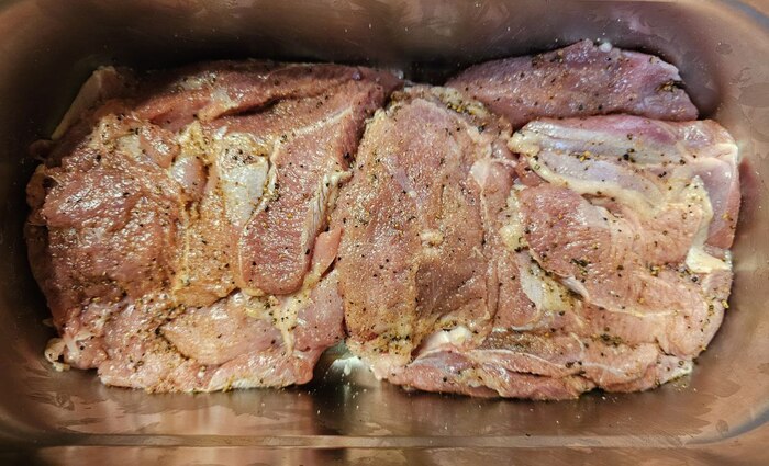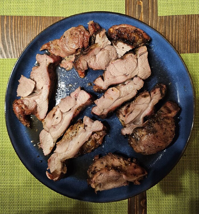 Жир не зачищаю, ничего не делаю. Вес - 900 грамм. Беру 1,5% соли от живого веса (14 грамм примерно, но тут регулируйте опытным путем, кто больше соли любит, кто меньше - все ж индивидуально), так же у меня есть заранее заготовленная смесь приправ - в равных пропорциях довольно крупно молотый черный перец, сушеный лук, сушеный чеснок, горчица и в три раза меньше сахара (ну типа если всего по три чайных ложки, то сахара - одна). Посыпаю всем этим делом индейку, как следует растираю и оставляю при комнатной температуре на полтора часа