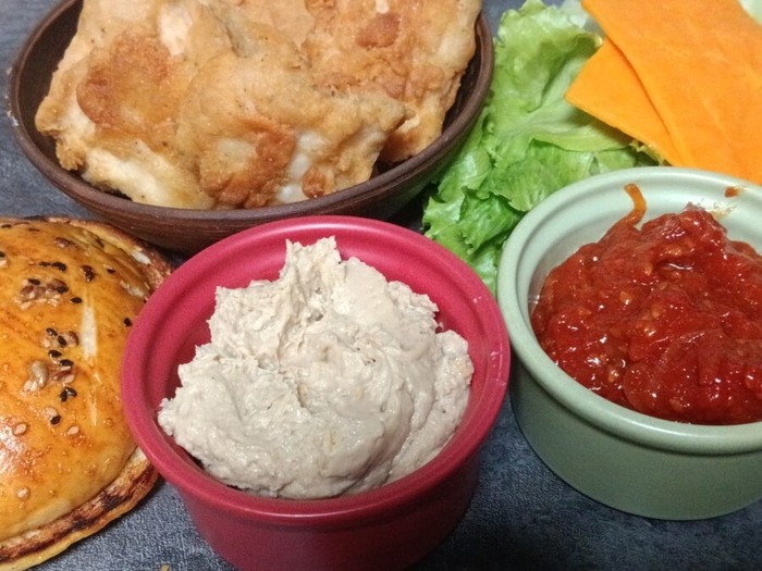 На нижнюю булочку выложите соус с тахини, затем салат айсберг, два куска чеддера, сверху жареную рыбу и острый томатный джем. Накройте верхней булочкой.