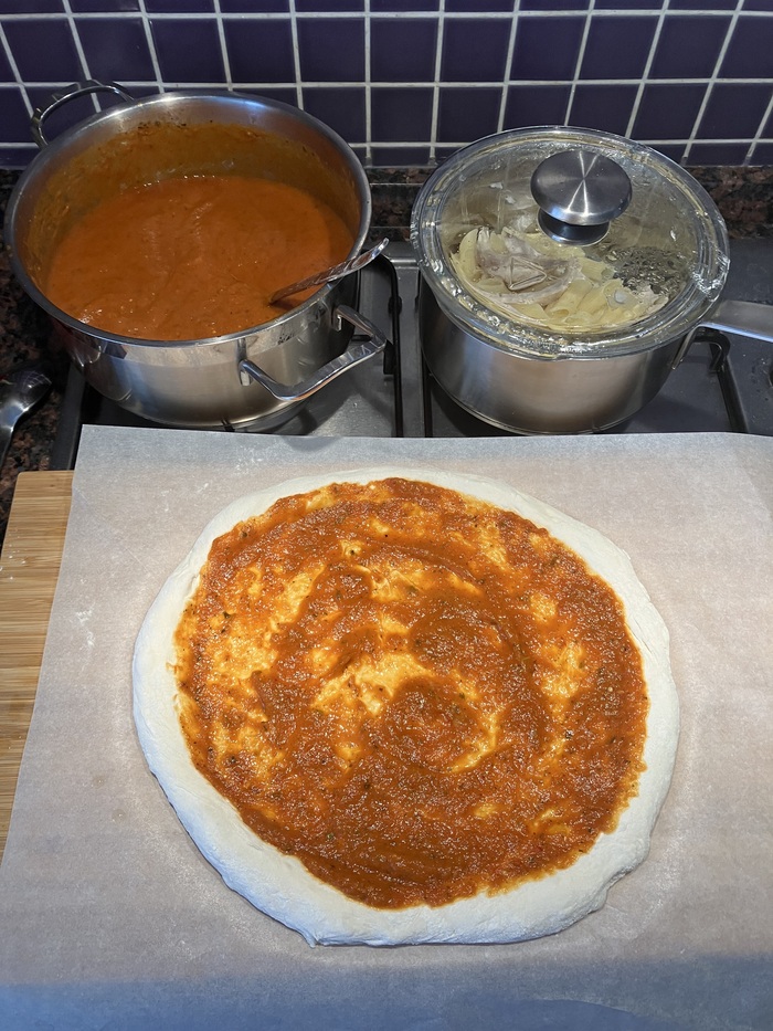 Сижу, никого не трогаю, решил передохнуть пока расстаивается тесто и подеградировать на пикабушке. И тут очередной высер от какого-то телеграмм канала, где с помощью кетчупа и мазика собирают пиццу. Вобщем у меня произошёл режим знатного охеревания и я схватив первый попавшийся тапок решил отснять как готовить пиццу. Да неидеально и любители сложить пальчики вместе скажут что не кошерно белиссимо, но это просто быстрый рецепт когда захотелось вкусной пиццы и результат радует.
