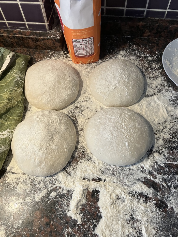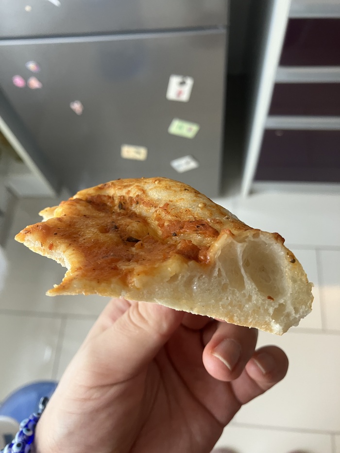 Времени особо не было, поэтому пошёл билдом через пулишь и потом основное тесто с гидратацией где-то 80%. Расстойка в тёплом месте где-то четь меньше часа. Не холодная расстойка в ночь, потому что резко захотелось пиццы.