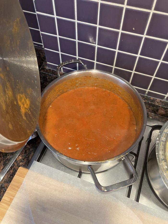 А вот тут у нас не кетчуп, а нормальный томатный соус. Сварен из замороженных помидорок, выкидывать же жалко. Поэтому морозим и делаем пиццу. Соус готовится просто - обжариваем лук и чуток чеснока, туда закидываем помидорки можно добавить красного сладкого перца, но немного, чтобы не "забил" весь вкус. Туда же добавляем пару ложек оливкового маслица, потом ещё чеснока, чтобы дать более чесночный вкус, базилик (был только сушёный) и солим по вкусу. Потом перебиваем блендером. Если хочется изъебнуться, можно ошпарить свежие помидорки кипяточком, снять шкурку и пробить их потом деревянной толкушкой из Иггдрасиля, но не стоит забывать основной принцип пиццы.