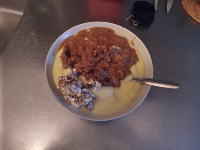 Разморозил сегодня кусок грамм на 700 и пошёл гуглить. Так как я ленивый рукожоп, то рецепты типа "сначала приготовим брусничный соус" или "возьмём бутылку красного вина" сразу отметаются. Нету у меня брусники, хоть она и растёт не далеко от дома и вино у нас не продают по воскресеньям (Финляндия и крепкий алкоголь не продают). И почему надо брать 1 бутылку вина? Всё должно быть предельно просто и из доступных продуктов. Ну короче через пол часика я нашёл, что мне подходит. Грибы, сметана, лук, оленина, специи. Пока ходил за сметаной в магазин, собрал несколько белых грибов и немного из морозилки достал подберёзовиков.