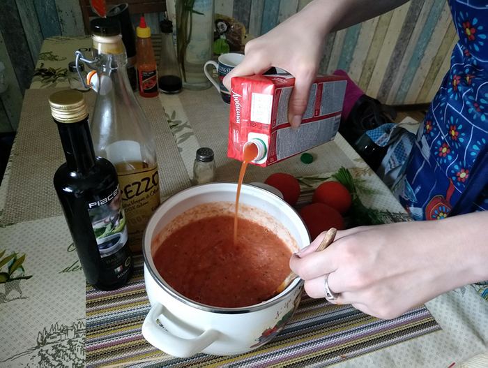 Теперь гаспачо надо довести до нужной консистенции. Если у вас были идеальные помидоры, много идеальных помидоров - смело берите просто вкусную воду, все получится. Но увы, реальность вносит коррективы, в июне не всегда удается купить действительно спелые и душистые - в случае, если есть сомнения, разводите гаспачо томатным соком. Он все компенсирует. Я беру литр сока и доливаю на глазок - миллитров 500-700, до той густоты, какая мне нравится. NB, «Любимый» - так себе вариант, но проклятый карантин подкосил наш супермаркет, другого сегодня не нашла.