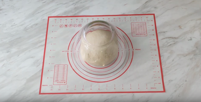 Смешать муку, разрыхлитель и соль. Натереть в муку на крупной тёрке холодное масло или нарубить его ножом. Добавить холодные молоко и сметану. Замесить тесто, сформировать тесто в шар и убрать его в холодильник минимум на 1 час.