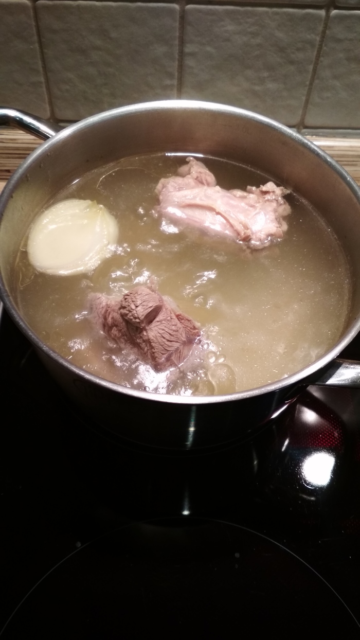 В кастрюлю (3 л.) кладем вымытое мясо, заливаем холодной водой и доводим до кипения. Наличие мозговых костей приветствуется.