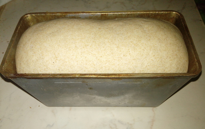 Долил в дрожжи еще полстакана теплой воды и стакан теплого молока (стандартная пропорция 1:1, можно печь хлеб только на воде), размешивая столовой ложкой добавил понемногу стакан муки (просеивая кружкой). Затем добавил растопленное и остывшее сливочное масло ( в стандартном рецепте растительное 3-5 ст.л.), соль, и второй стакан муки.
