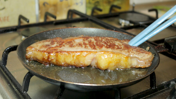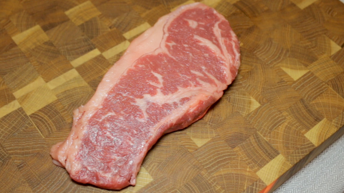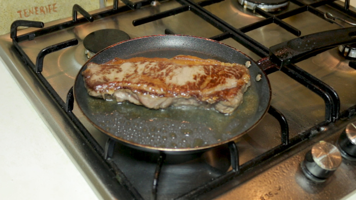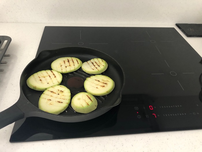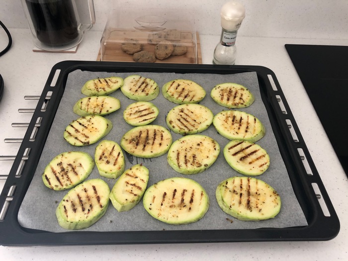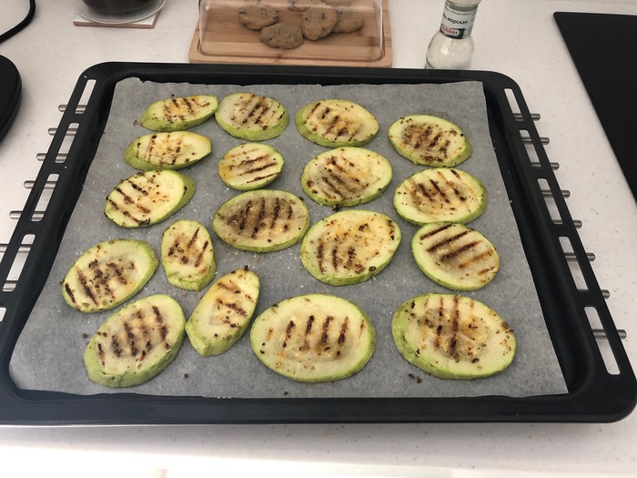 2. Нарезаем кабачок ломтиками и обжариваем с двух сторон на сковороде гриль до появления характерных полосок. Выкладываем на противень