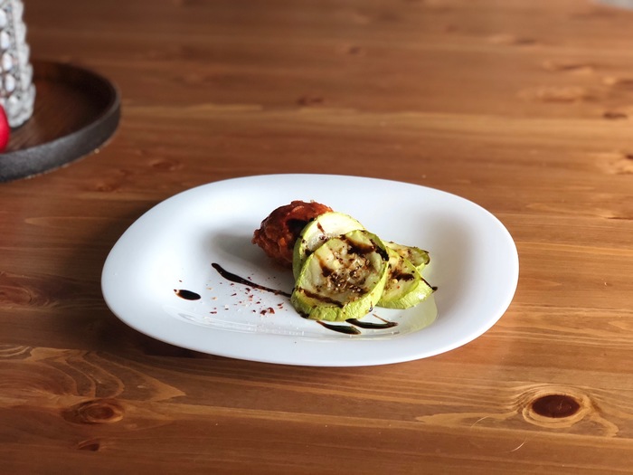 7. Подаем как дополнение к гарниру или как закуску. Например, на этой тарелке мой «перекус» — куриная тефтелька в соусе и кабачки — 166 Ккал.