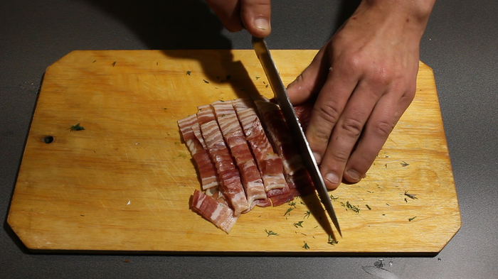 Переходим к самой вкусной части готовки, конечно же к нарезке бекона, бекон нарезаем небольшими кусочками, но никак не в труху. Дабы удешевить данный рецепт, можно использовать вместо бекона, цена на который кусается, мелко, ОЧЕНЬ МЕЛКО, нарезанное сало или ешё что-нибудь, пишите свои варианты в комменты.
