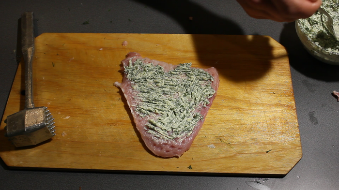 А теперь соединяем мясо с начинкой. Отбитый кусок мяса смазываем замешанным маслом тонким слоем, при жарке часть масла вытечет, но мясо успеет взять вкус и стать нежнее. Поверх масла выкладываем кусочки бекона, если бюджет позволяет, то берите на килограмм мяса – 250-300 грамм бекона, так будет просто БОГОПОДОБНО, но у меня бекона было изначально только грамм 80.
