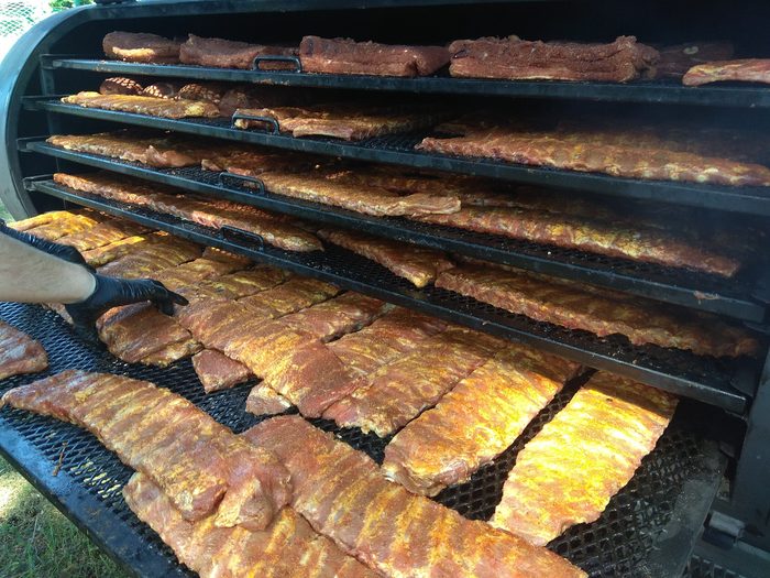 На заднем плане ребята борются с гарнирами, а я готовлюсь заряжать ребра, прочету и брискет.