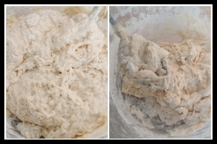 Оно все еще будет липнуть к рукам, но несильно. Ваша задача замесить в тесто ту муку, что по стенкам миски. Можете слегка подсыпать, но не сильно. И не надо вымешивать тесто. Просто смешайте на грани липнет/не липнет. Тут только практика)))
