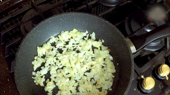 Для сокращения времени приготовления я использую одновременно две сковороды. На маленькой, на среднем огне, на сливочном масле обжариваю лук.