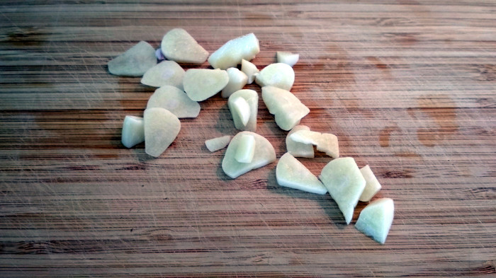 Сразу почистите лук. И порежьте кубиками. Данное блюдо любит много лука, но достаточно мелко порубленного. Не полукольцами и не кольцами. Потому что это будет соус. И сразу же чеснок дольками. Чеснок в рецептуре не указывал, так как отношу его к специям. Можете обойтись без него, если не любите.