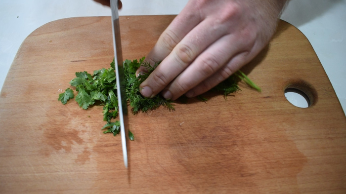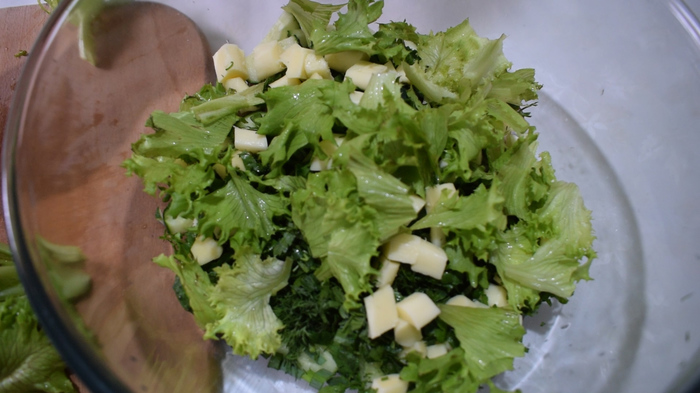 Сливочное масло и сливочный сыр перемешать с зеленью.