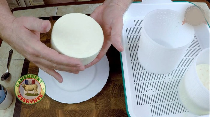 После это необходимо дать сыру созреть. Для этого вам понадобится пищевой контейнер, на дно которого необходимо постелить два слоя бумажных салфеток, сверху на них положить дренажные коврики, а на них сыр. После этого нужно закрыть контейнер и поставить на две недели в холодильник. Камамбер нужно выдерживать при температуре 6-8ºС. Ежедневно сыр нужно переворачивать, чтобы плесень разрасталась равномерно.