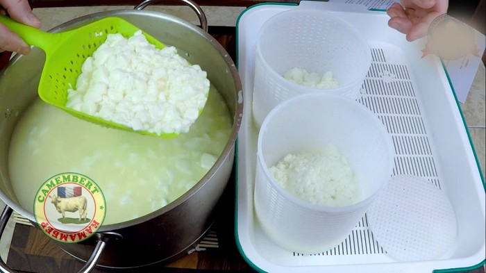 Выложите в контейнер 2 дренажных коврика, поставьте 2 формы для камамбера и аккуратно переложите сгусток в формы.