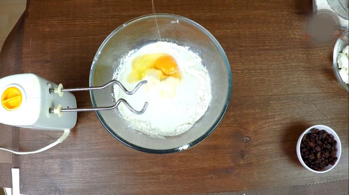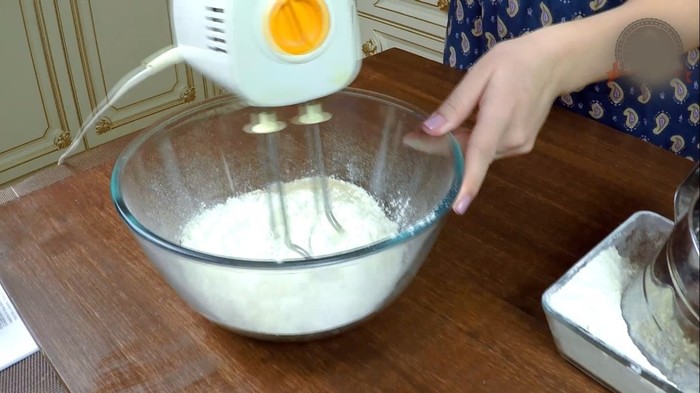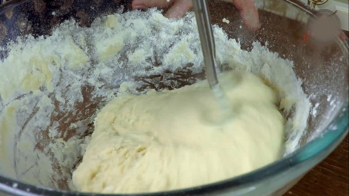 Теперь добавить творог (у меня 9% жирности) . Творог берите не зернистый. И продолжайте замешивать тесто миксером с насадкой крюк на низкой скорости. Постепенно подсыпая оставшуюся муку замесить мягкое тесто до гладкого, эластичного состояния. Если видите, что миксером не получается- домесите руками.