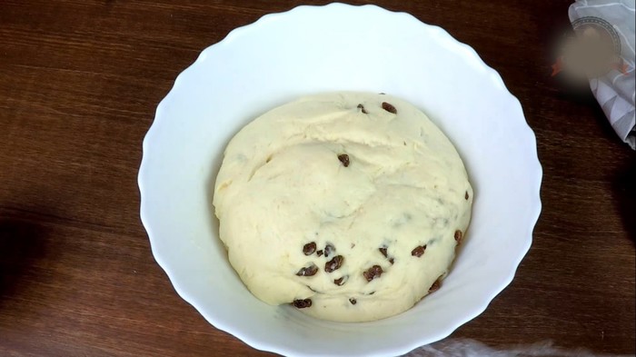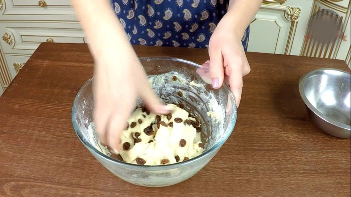 В конце добавить наполнитель. В моем случае -это изюм. Так же можно взять цукаты, орехи или темный шоколад. Кому как больше нравиться. При этом изюм заранее замочила в теплой воде на 10 минут и потом обсушила бумажным полотенцем. Если вдруг будете добавлять орехи или шоколад, то измельчите их слегка ножом, но не мелко, чтобы потом ощущались в куличе.