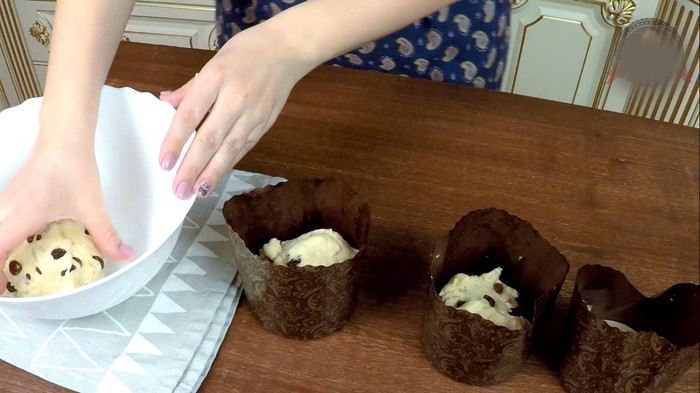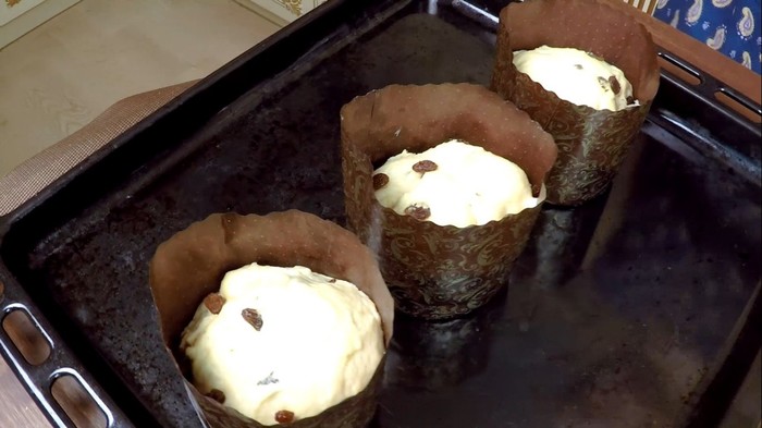 Выложить тесто в подготовленные формы, заполняя их наполовину. Такие формы для куличей продаются в любых магазинах накануне Пасхи. Причем смазывать маслом и присыпать мукой их не нужно. Накрыть полотенцем или пакетом и оставить подходить еще на 45-60 минут. Вторая расстойка нужна для повторного удвоения теста в размерах.