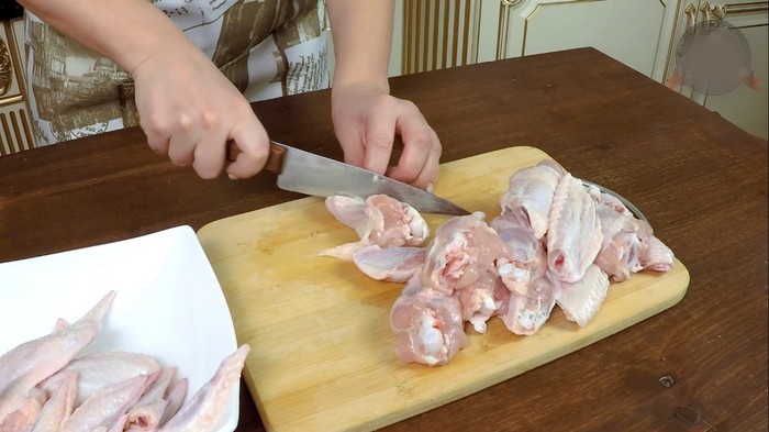 • Разделить с помощью ножа на 3 части. Кончик крыла для рецепта не потребуется. Его можно оставить для бульона.