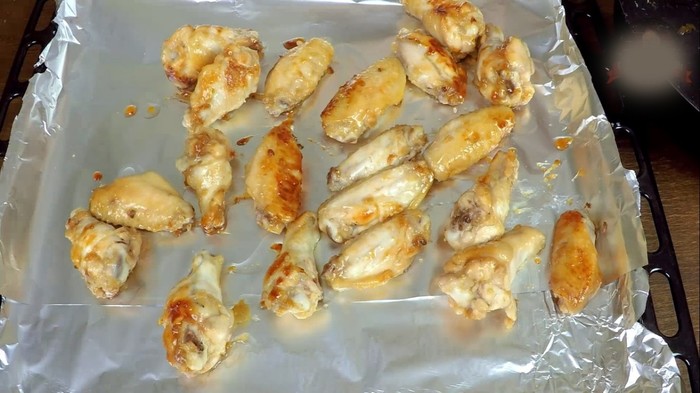 • Теперь, когда крылья поджарились, включить духовку до 200 градусов. Противень застелить фольгой. Выложить крылья.