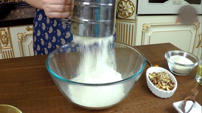 Орехи порезать ножом, но не очень мелко, чтобы потом ощущались в кексе.