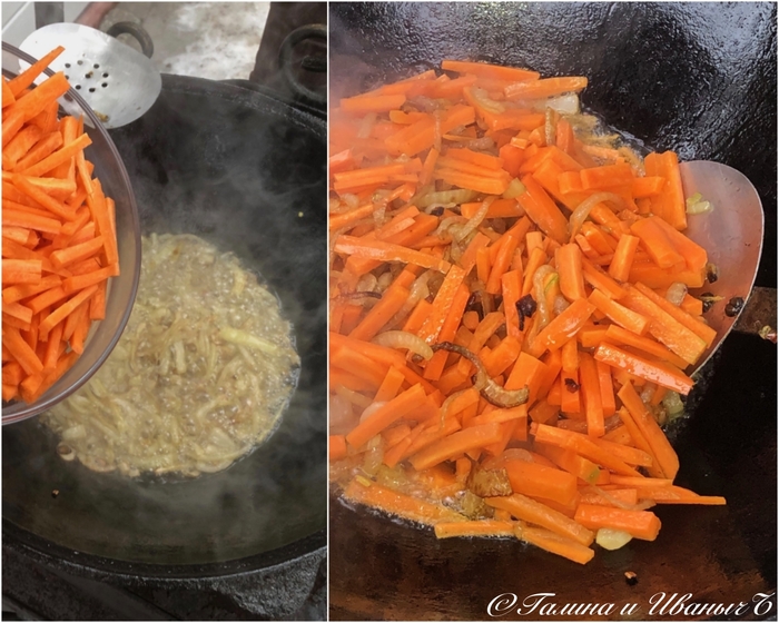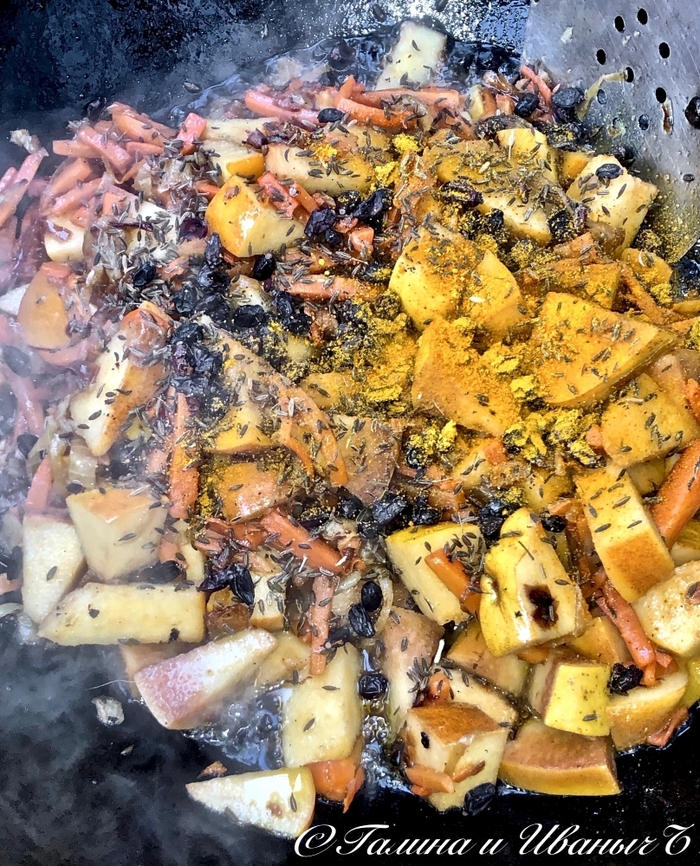 Соединяем мясо и томатно-овощную смесь в посуде, в которой будем тушить наше блюдо. Добавим воды (лучше использовать овощной или говяжий бульон), но, думаю, сильно не будет отличаться, потому, что в нашем блюде есть уже и говядина, и овощи. Тушим, с плотно накрытой крышкой (использовали фольгу - не нашлось крышки такого диаметра ), на слабом огне около 2 - 2,5 часов. Периодически проверяем на наличие жидкости в сковороде, при необходимости добавляем, что не пригорел томатно-овощной соус. К концу готовки соус должен выпариться в половину.