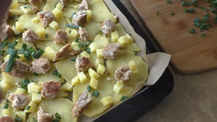 Сверху распределяем кусочки колбасок, порезанный зеленый лук и оставшуюся картошку (порезанную кубиком).