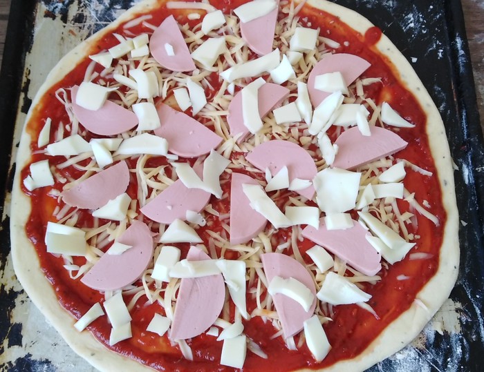 После этого берём противень, смазываем его чуток подсолнечным маслом и заливает наше тесто. Ставим в духовку на 180 градусов примерно на 20-25 минут. А пока можно сварить крем или помыть посуду. Я был хитёр и заранее купил готового (почти) заварного крема. Его высыпаешь в кастрюльку, заливаешь молоком и варишь 3-5 минут, ещё можно масла сливочного добавить.