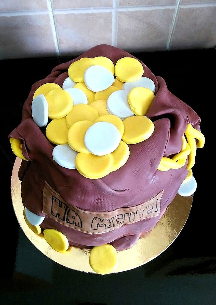 С данного торта началась наша эпопея изготовления сладких десертов, это самый первый сделанный нами торт. Так как именинник, кому предназначался подарок, является мужчиной (а по-совместительству и моим батей =)), то задача по украшению была очень нетривиальной, мужской торт как никак! Поэтому было решено обтянуть его мастикой и придать форму мешка денег. Сказано - сделано! Если приглядеться, то на фото можно заметить как мы постарались передать текстуру мешка. В те далёкие времена слово "кандурин" для нас было сродни ругательству, поэтому золотые монетки были просто желтыми, без благородного блеска). Надпись наносили пищевыми фломастерами и, скажу я вам, они не очень удобны в использовании и недостаточно яркие, поэтому не советую их использовать. Пусть на изготовление и оформление ушло достаточно много времени, но это: "вау! Вы серьезно сделали это сами?" - было очень приятно и лестно слышать, ну и послужило отправной точкой в нашем маленьком хобби.