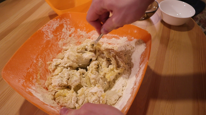 Беру миску с картофельной массой и ложкой разбиваю ее на маленькие кусочки. Добавляю к ней примерно половину подготовленной сливочной смеси и все хорошо перемешиваю. Получившейся массой заполняю все картофельные лодочки и выравниваю поверхность.