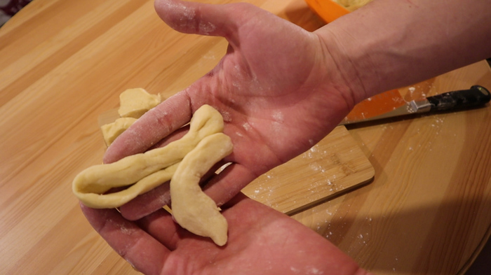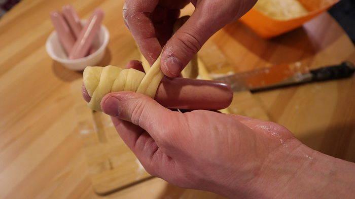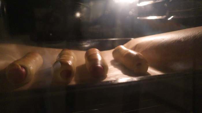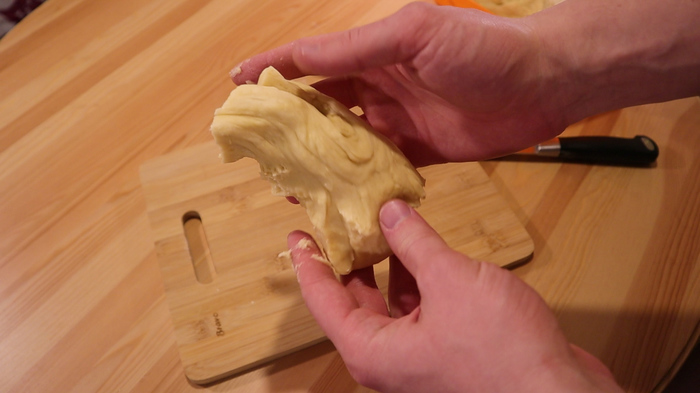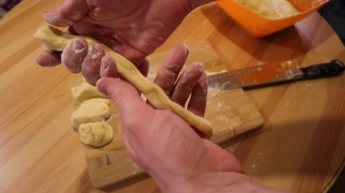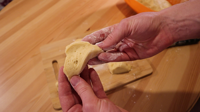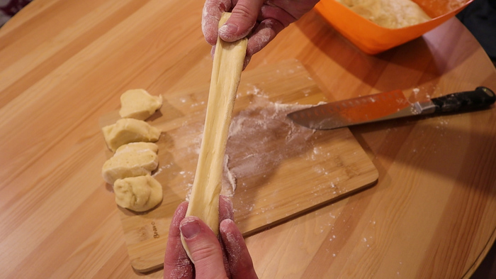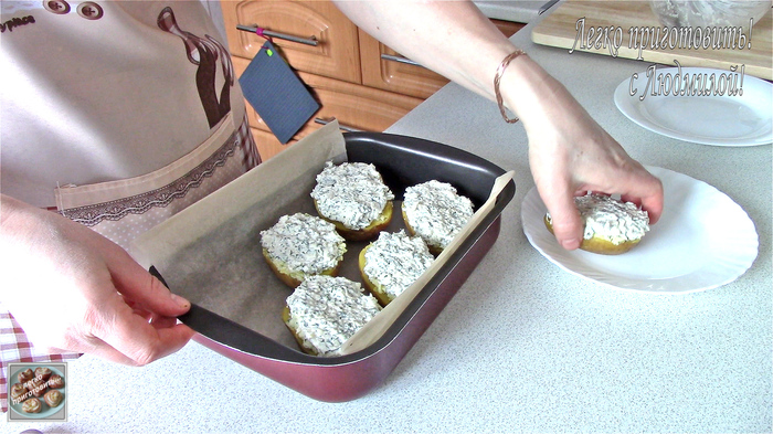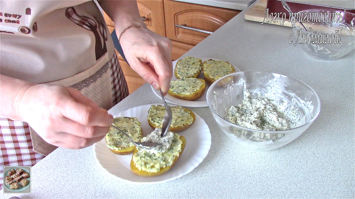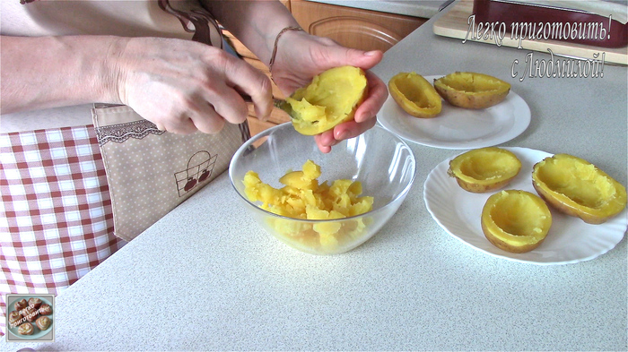 Готовый картофель вынимаю из духовки, даю ему немного остыть и освобождаю его от фольги. Затем каждую картофелину разрезаю вдоль на две примерно одинаковые части. Маленькой ложечкой аккуратно вырезаю картофельную мякоть, оставляя стенки толщиной примерно полсантиметра, чтобы получились картофельные лодочки. Картофельную мякоть складываю в отдельную миску.