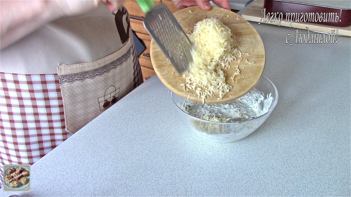 Подготовлю сливочную заправку. В отдельную миску кладу измельченный чеснок, размягченное сливочное масло комнатной температуры, сметану, соль, черный молотый перец, мелко порезанный укроп (можно свежий, но у меня замороженный), натертый на средней терке полутвердый сыр. И все хорошо перемешиваю. При добавлении соли нужно учесть, что сыр соленый.