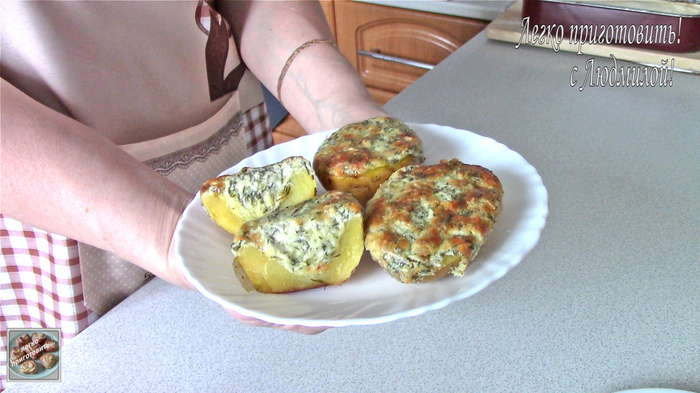 Поэтому я беру крупный картофель, хорошо его мою и обсушиваю бумажным полотенцем. Каждую картофелину отдельно плотно заворачиваю в несколько слоев фольги и кладу его в форму. Форму с картофелем ставлю в заранее разогретую до 180 градусов духовку и буду запекать его до полной готовности. Готовность проверяю деревянной палочкой. Время запекания зависит от духовки и величины картофелин. Сегодня мне на это потребовалось 50 минут.
