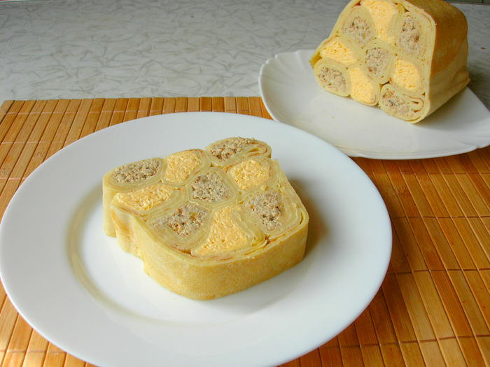На каждый кусок мяса выкладываем начинку, примерно 1 ст.л., и сворачиваем в рулетик.