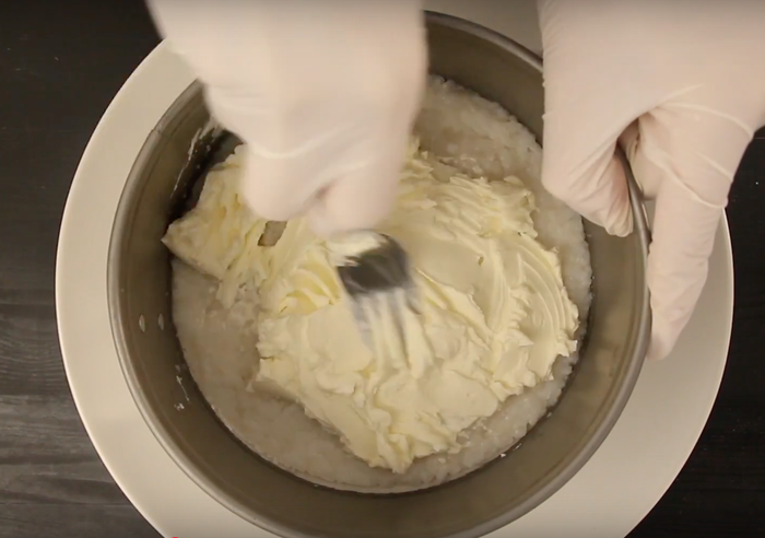 Дно и бока формы смазываю сливочным маслом и посыпаю панировочными сухарями. На дно формы равномерно выкладываю рисовую смесь, выравниваю ее. И на нее выкладываю всю творожную смесь. Так же равномерно распределяю ее и выравниваю. Сверху запеканку смазываю сметаной. Это делается для того, чтобы на запеканке во время выпечки не образовывалась корочка, и она не вздувалась.