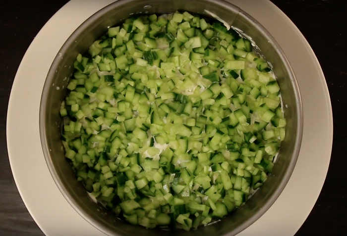 Следующий слой мясо краба и опять слой оставшегося риса. Смешиваем майонез с чесноком и смазываем рисовый слой. Режем мелко огурец и укладываем следующим слоем.