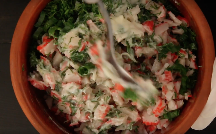 Смешиваем майонез с чесноком и делим на две части. Режем зелень и крабовые палочки, заправляем половиной чесночного соуса и смешиваем.