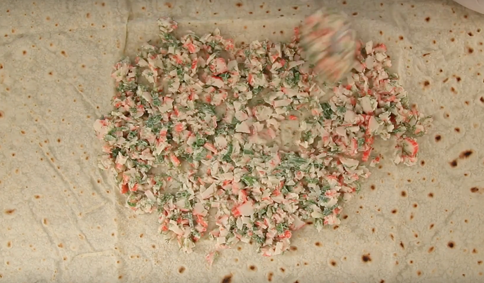 Берем лаваш и кладем на наго смесь зелени и крабовых палочек, распределяем ровным слоем.