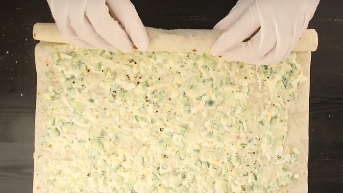 Кладем сверху второй лист лаваша и ровным слоем распределяем смесь огурца и яйца, солим и перчим по вкусу.