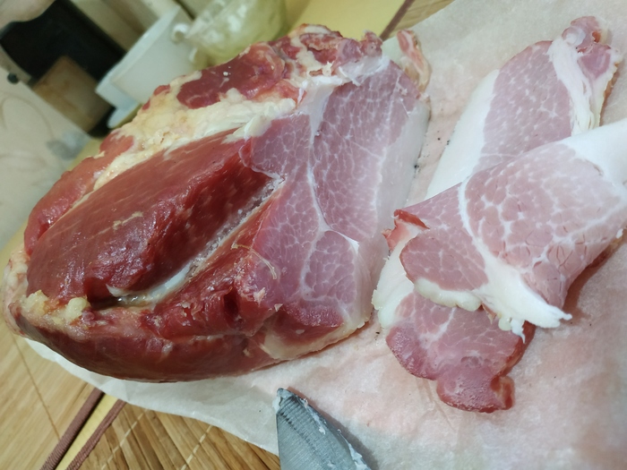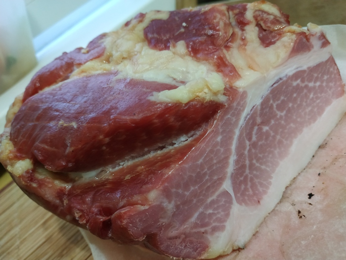 Мясо (на фото то ли окорок, то ли лопаточная часть) любое без кости. Иначе я просто пока не знаю, как процентовку нитритки подбирать.